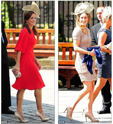 Making a statement: Singer Una Healy (left) wore a floral bandeau dress and tilted hat, while actress Katherine Kelly wore a pale pink asymmetrical number at the wedding of Zara Phillips and Mike Tindall yesterday